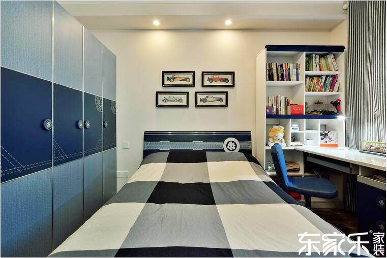 小房間室以暗藍和朱黑色為核心色采,朱黑色的墻面上和辦公桌書廚與暗藍的定制衣柜和靠背椅接接系,再達配幾幅色采豐厚的掛畫,讓面積倍增是較為活躍的是較為活躍的。