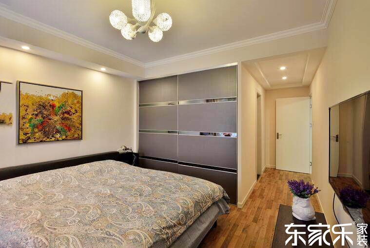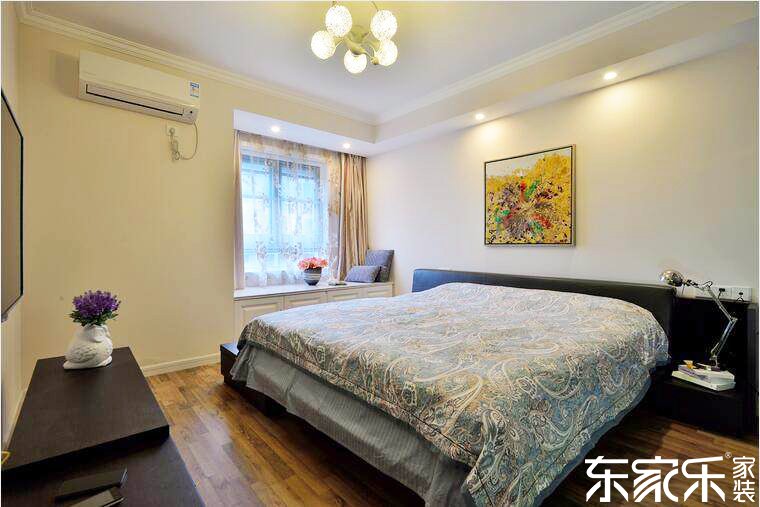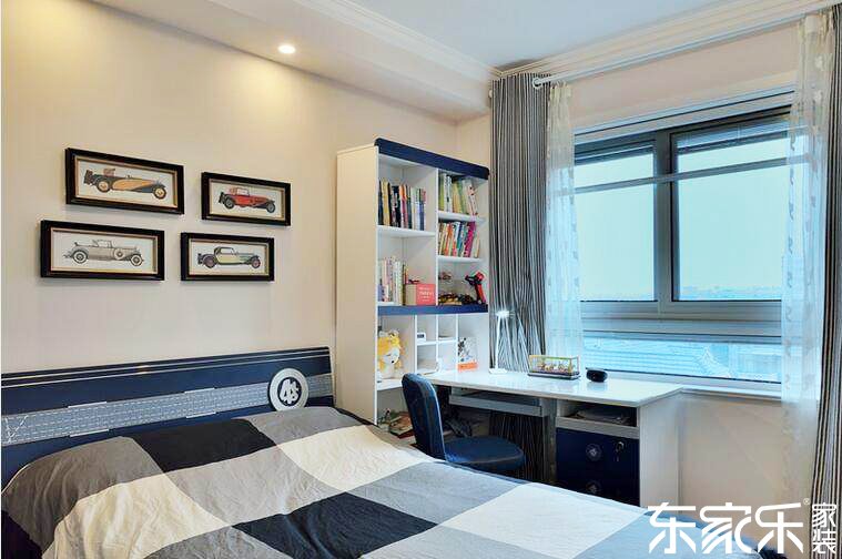 臥室室以灰和粉藍色來源于色采,搭配方法藍色和黑色的家居裝飾,看出來也是增強密密麻麻活氣。乳粉藍色的的墻與簡約色的木復合地板豐富了余地的祥和度,藍色的裝潢畫和黑色的熏衣草裝潢花則富饒了余地的色采。